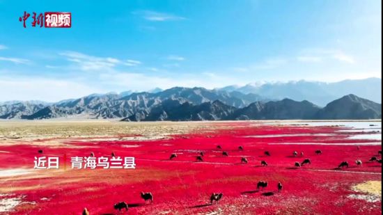 深秋10月,地处柴达木盆地的青海省乌兰县都兰湖国家湿地公园岸边的盐生植物盐爪爪染红了大地,似一块巨大的红地毯,蓝天、白云与高山交相辉映,和前来觅食的骆驼一起,形成了一幅色彩斑斓的油画。