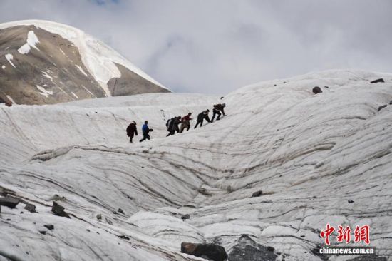 资料图为2022年7月15日,雪线测量队队员们在阿尼玛卿冰川徒步准备进行测量。 马铭言 摄