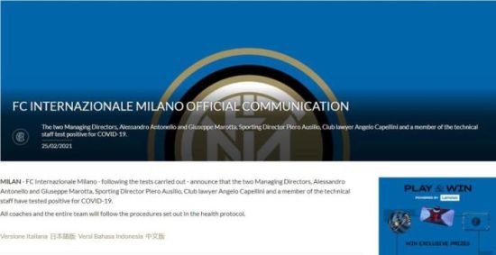 中新网2月26日电 意甲国际米兰足球俱乐部于北京时间25日晚发布官方声明,宣布球队四名高层新冠检测呈阳性。