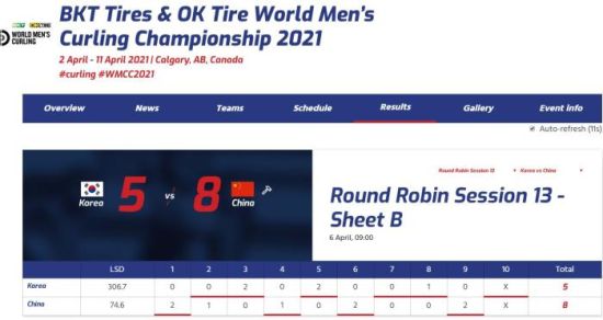 中国男子冰壶队获世锦赛第二胜 目前位列第12位