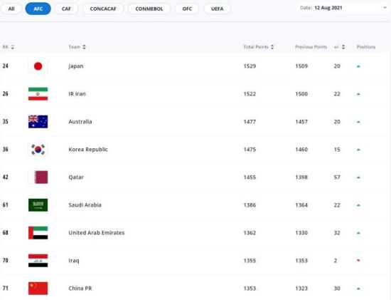 中新网北京8月12日电 北京时间12日,国际足联网站公布了最新一期国家队排名,中国男足相比于上一期排名上升了6位,目前排在世界第71,亚洲球队中排名第9。中国女足本期排名世界第15,亚洲球队中排名第4。