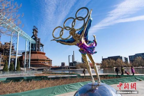 12月1日,位于北京冬奥组委办公区前的一座冬奥主题雕塑在阳光映照下熠熠生辉。 中新社记者 侯宇 摄
