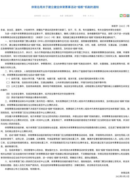 公告称,地方各级体育部门要督促各类体育赛事活动组织者密切关注气象、水利、地震、自然资源、交通运输、卫生健康、应急管理等部门发出的预警信息及有关灾害、事故信息,加强防范,及时启动“熔断”机制。