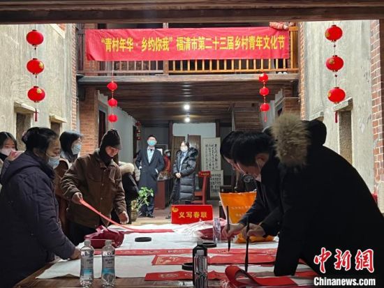 中新网福州1月22日电 (张铁国 陈诗雨)“青村年华·乡约你我”福清市第二十三届乡村青年文化节,21日在福建省福清市江镜镇南宵村举行。来自福清市青年创业促进会、福清市书法家协会等部门的30余名青年志愿者,为村民送来了丰富的“文化年货”。