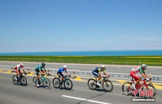 资料图为第二十四届环大美青海国际公路自行车赛的车手在青海湖畔骑行。 马铭言 摄