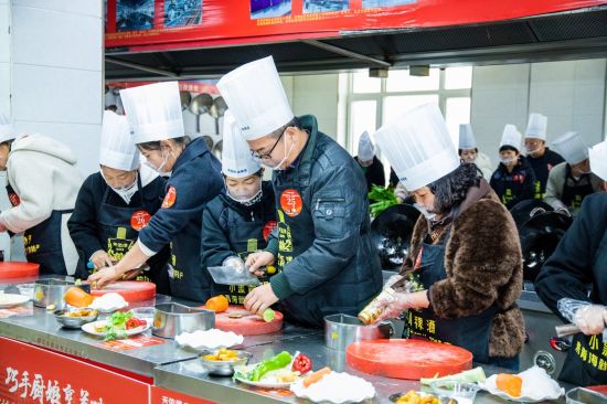 赛场之上,烟火气升腾,热闹非凡。标准化的操作台前,45位厨娘身着统一围裙、厨师帽,手持厨具,个个精神抖擞、身手利落。每位厨娘还邀请了1名亲友担任“帮厨”,切配、翻炒、调味,配合默契,锅碗瓢盆的碰撞声交织成一曲欢快的烹饪乐章,缕缕香气萦绕赛场,引得现场嘉宾与亲友团连连称赞。