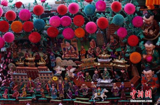 中新社青海塔尔寺2月16日电 题:藏传佛教圣地塔尔寺“三绝”之酥油花:百年梦境“云”上开花