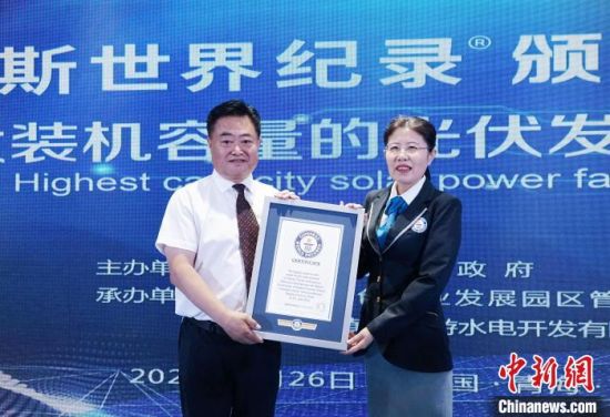 中新网青海海南6月26日电(祁增蓓)26日,青海省两项“绿电”项目——海南藏族自治州生态光伏园区与龙羊峡水光互补发电站获得吉尼斯世界纪录认证,成为世界最大装机容量的光伏发电园区和世界最大装机容量的水光互补发电站。