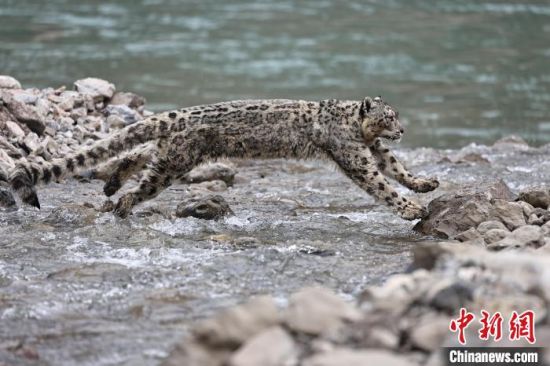图为三江源国家公园澜沧江源园区拍摄的雪豹跃过河流。(资料图)索南旦增摄