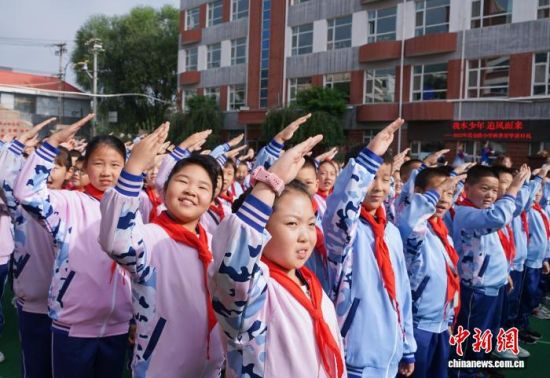 资料图为西宁市昆仑路小学举行开学典礼,在升国旗仪式上,小学生们敬队礼。 马铭言摄