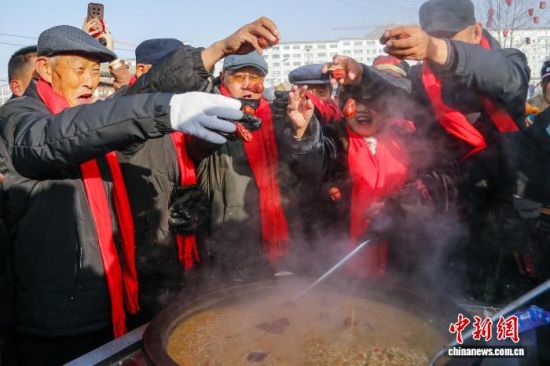 1月26日传统腊八节当天,拱海门广场右侧两口巨型铁锅内,青稞、牛羊肉、红枣、枸杞等食材熬制的“新品”腊八粥散发阵阵香味,引来民众排起长队。