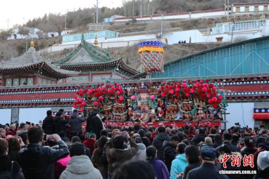 3月3日,青海省西宁市湟中区塔尔寺僧人将上花院的酥油花主尊——文殊菩萨固定在花架上。 马铭言 摄