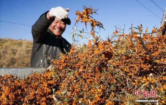资料图为青海省湟源县一沙棘林中,村民将采摘的沙棘果装车。马铭言 摄