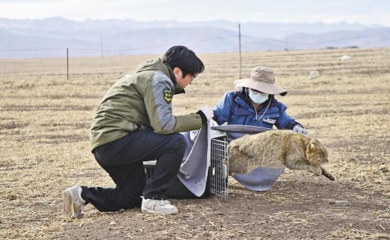 2月11日,祁连山国家公园野生动物救护繁育站在海北藏族自治州门源回族自治县老虎沟成功放归一只成年雄性荒漠猫。