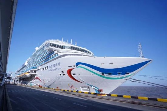 ▲国产首艘大型邮轮“爱达·魔都号”在吴淞口邮轮港停靠
