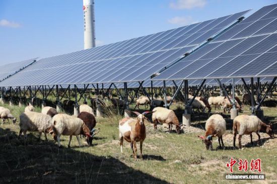 资料图为2025年9月17日,青海省海南藏族自治州共和县塔拉滩光伏产业园区内,羊群在光伏板下吃草。马铭言摄
